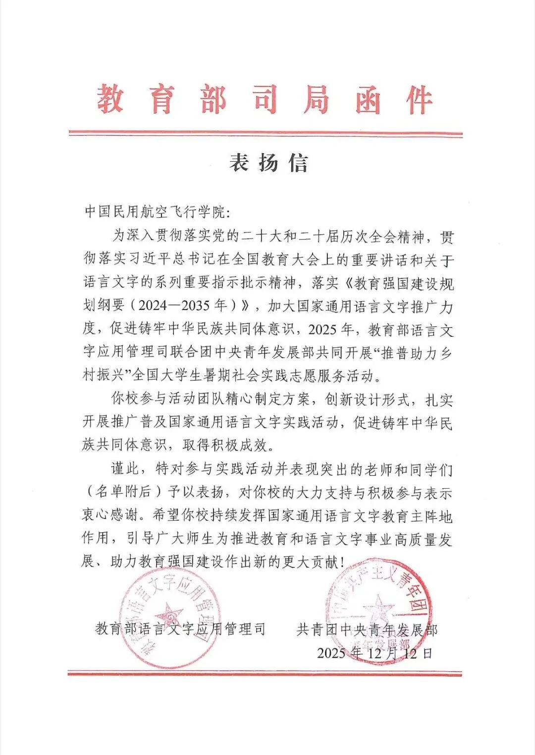喜报|教育部、团中央向我校发来表扬信
